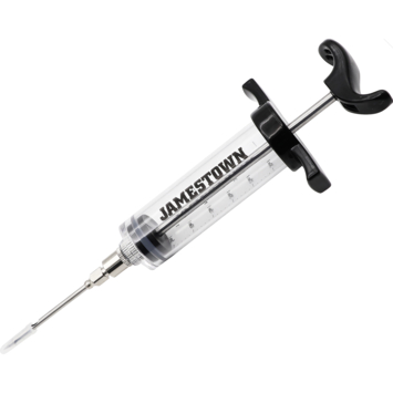 Met deze marinade injector van Jamestown breng je snel extra smaak in je gerecht. Je spuit de marinade diep in vlees, vis of groente, zodat het vanbinnen sappig blijft. Handig voor barbecuegerechten of ovenbereiding waarbij je op smaak wilt sturen. De injector heeft een inhoud van 30 ml en is volledig van roestvrij staal. Dat maakt hem stevig, veilig en eenvoudig schoon te maken. Door de slanke vorm ligt hij prettig in de hand en werk je precies. Ook dikkere marinades spuit je moeiteloos in. Zo bepaal je zelf hoe intens je gerecht wordt.