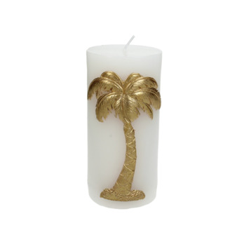 Deze stompkaars is uniek door de gouden palmboom in reliëf. Ook kun je kiezen voor een stompkaars met een flamingo erop. De kaars heeft een doorsnede van 7,3 cm en is 15 cm hoog.