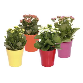 De Kalanchoë mix bestaat uit vier Kalanchoë planten in de vrolijke kleuren: rose, rood, geel en oranje. De Kalanchoë is een leuk vetplantje met hele jaar rond fris bloeiende bloemen. Deze variant, de Rosalina, heeft veel kleine bloemetjes bij elkaar. Elke plant heeft zijn eigen gekleurde pot. De plantjes zijn 28 centimeter hoog, inclusief (keramieken) bloempot. De potten hebben een diameter van 13 centimeter. De Kalanchoë is een supersterk vetplantje dat absoluut tegen een stootje kan.