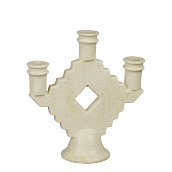 Deze opvallende kandelaar combineert een geometrisch design met een zachte, zandkleurige afwerking. De bijzondere vorm met drie houders maakt hem tot een echte blikvanger op tafel of dressoir. Gemaakt van keramiek en perfect voor dinerkaarsen in natuurlijke tinten. Ook zonder kaarsen voegt hij karakter toe aan je interieur. De afmetingen zijn L21 x B8 x H23,5 cm.
