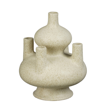 Deze kandelaar valt op door zijn sculpturale vorm en zachte, zandkleurige afwerking. De organische lijnen en meerdere houders geven hem een moderne en kunstzinnige uitstraling. Mooi met kaarsen in neutrale tinten of juist als opvallend object zonder kaarsen. Zet hem op tafel, een dressoir of in een open kast voor een stijlvol accent. De afmetingen zijn L22,5 x B22,5 x H29,5 cm.
