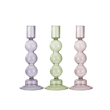 Mooie glazen bubbel kandelaar. De kandelaar is verkrijgbaar in diverse kleuren en diverse hoogtes. Combineer verschillende kleuren met elkaar en maak het extra gezellig op tafel. De kandelaar heeft een hoogte van 20 cm en is gemaakt van glas.
