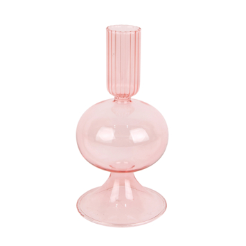 Leuke kandelaar in een ronde vorm gemaakt van glas. Ook verkrijgbaar in verschillende kleuren. Combineer onze verschillende kandelaren en onze gekleurde kaarsen met elkaar voor een extra leuk effect. De kandelaar is 14,5 cm hoog.