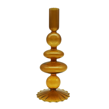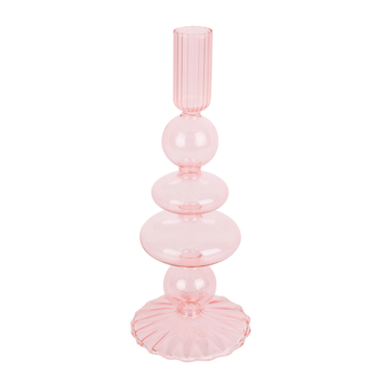 Leuke kandelaar in een ronde vorm gemaakt van glas. Ook verkrijgbaar in verschillende kleuren. Combineer onze verschillende kandelaren en gekleurde kaarsen met elkaar voor een extra leuk effect. De kandelaar is 22 cm hoog.