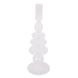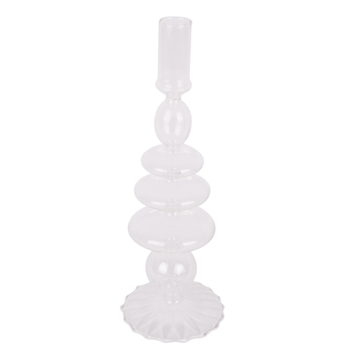 Leuke kandelaar in een ronde vorm gemaakt van glas. Ook verkrijgbaar in verschillende kleuren. Combineer onze verschillende kandelaren en gekleurde kaarsen met elkaar voor een extra leuk effect. De kandelaar is 28 cm hoog.