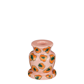 Breng een speelse twist in huis met deze opvallende keramieken kandelaar. De lichtroze kleur en luipaardprint trekken meteen de aandacht. Dankzij het compacte formaat past hij moeiteloos op een bijzettafel, vensterbank of dressoir. De subtiele glans en ronde vormen geven hem een moderne uitstraling. Zet hem solo neer voor een krachtig accent of combineer met andere kleuren voor een speels effect. De afmetingen zijn H9 x ø7,5 cm.
