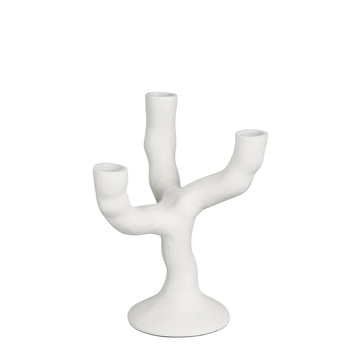 Gebruik deze drie-armige kandelaar om de sfeer tijdens het diner te verhogen of als je extra verlichting nodig hebt bij het lezen. Hij heeft een unieke vormgeving en een stabiel voetstuk, dus je hoeft niet bang te zijn dat ie omvalt. De kandelaar is vervaardigd van aluminium en heeft een elegante gebroken witte kleur. Ook zonder kaarsen doet deze kandelaar van 16 cm lang, 15 cm hoog en 19 cm lang het prima als pronkstuk.