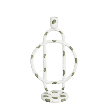 Voor iets unieks in huis zoek je niet verder. Deze handgemaakte kandelaar past dan helemaal bij jou. Het is een gebroken wit met groen gevlekt model dat zelfs voorzien is van de handtekening en de datum van vervaardiging van de kunstenaar. De kandelaar is vervaardigd uit aluminium en tevens voorzien van een stevige voet die voor extra stabiliteit zorgt. Het geheel heeft een afmeting van 17 cm lang, 10 cm breed en een hoogte van 30 cm.