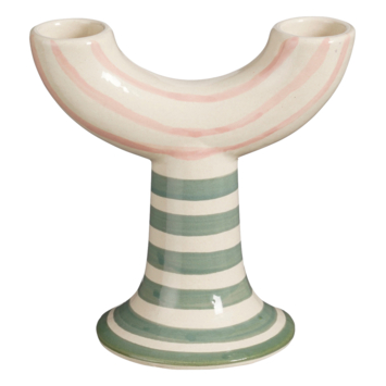 Deze kandelaar voegt een beetje vrolijkheid aan je interieur toe. Deze kaarsenhouder, met strepen in het roze en groen, heeft ruimte voor twee dinerkaarsen. Plaats hem op een bijzettafel, dressioir op zelfs nachtkastje en je creëert in een mum van tijd een gezellig plekje! Hij is gemaakt van keramiek en meet H12 xø12 cm.