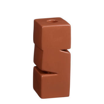 Deze terrakleurige kandelaar van Theo-Bert Pot heeft een strak, bijna sculpturaal ontwerp dat direct in het oog springt. De geometrische vorm met speelse insnijdingen geeft het keramiek een verrassende en moderne uitstraling. Met een lengte en breedte van 7,5 centimeter en een hoogte van 18 centimeter is het een compact object dat perfect tot zijn recht komt op een plank, kast of salontafel. Met of zonder kaars straalt deze kandelaar rust, warmte en karakter uit. Een subtiel statement dat past in elk interieur.