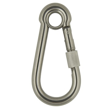 De karabijnhaak dicht oog met schroefborging 10x100mm is een karabijnhaak met een dicht oog in de afmeting 10 bij 100 millimeter. De karabijnhaak is gemaakt van het hoogwaardige roestvast staal 316 en is daardoor goed bestand tegen zowel zoet als zout water. Het dichte oog zorgt ervoor dat een touw dat door het oog loopt op zijn plaats gehouden wordt. Voor extra veiligheid heeft deze haak een extra schroefborging. Een veilige werkbelasting voor deze haak is maximaal 380 kilogram, de breeklast is 1150 deca Newton (daN), dit is ongeveer gelijk aan 1150 kilogram. Dat maakt de haak geschikt voor de meeste lichte bevestigingsklussen.