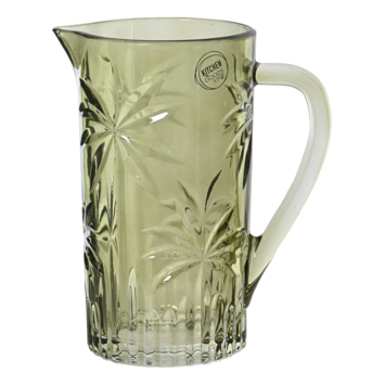 In het glas zit een palmbomendesign verwerkt. Dit patroon is zichtbaar, maar niet opvallend aanwezig. De vorm is eenvoudig en praktisch, waardoor je de karaf dagelijks kunt gebruiken.