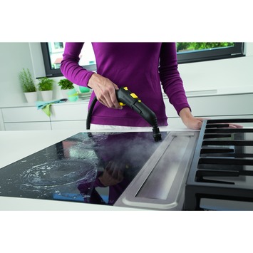 De Kärcher stoomreiniger SC 2.500 C is een stoomreiniger van de nieuwe generatie. De stoomreiniger scoort vanwege zijn moderne design, het grote gebruiksgemak en de voorbeeldige energie-efficientie. De afneembare watertank heeft een inhoud van 0,8 liter en kan continu bijgevuld worden, zonder dat je je werk hoeft af te breken. De stoomdruk van 3.2 bar en het vermogen van 1500 watt garanderen een hoge stoomprestatie. Zo verwijder je bijvoorbeel lijmresten, vetafzettingen en hardnekkig vuil met gemak. Gebruik de stoomreiniger in de badkamer, keuken en elders en geniet van onder andere schone ramen, tegels en voegen. Je kunt de stoomreiniger zowel voor het grovere schoonmaakwerk als voor het precisiewerk gebruiken. De stoomreiniger heeft eenvoudige bedieningselementen, is makkelijk te manoevreren dankzij de grote wielen en is in amper 6 minuten opgewarmd voor gebruik. De stoomreiniger reinigt zonder gebruik te maken van chemische producten of reinigingsmiddelen, zo breng je dus geen schade toe aan het milieu.