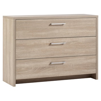 Ladekast Karlijn heeft 3 laden die voorzien zijn van solide metalen ladegeleiders en een moderne metalen greep. De laden hebben een eikendecor toplaag. De ladekast is ook verkrijgbaar met 2 laden of 6 laden en in de kleuren wit met houtnerfstructuur en steigerhoutlook. Ladekast Karlijn is perfect te combineren met een bijpassende kast.