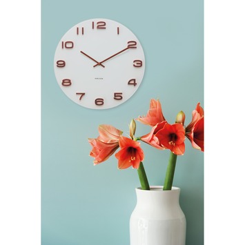 Karlsson wandklok Vintage glas wit 35cm heeft een retro look, maar is tijdloos. De koperkleurige cijfers geven een warme uitstraling. De wandklok is makkelijk te combineren in iedere ruimte, van keuken tot woonkamer. Deze klok is ook verkrijgbaar in de kleur zwart. Exclusief 1 AA batterij. Karlsson wandklok Vintage glas wit 35cm heeft een diameter van 35 centimeter.