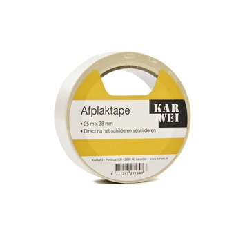 De KARWEI afplaktape 25mx38mm is een brede afplaktape van het KARWEI eigen merk. Afplaktape voorkomt dat er (grond)verf komt op plaatsen waar je het niet wilt hebben. Afplaktape is dus een goede hulp om nauwkeurig te kunnen werken bij eenvoudige schilderklussen zoals muren, plinten of plafonds schilderen. De afplaktape is geschikt voor het afplakken van vlakke ondergronden. De tape dient na het schilderen direct verwijderd te worden.