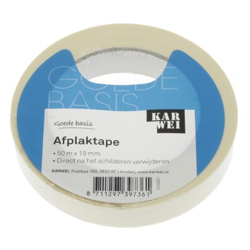 De KARWEI afplaktape 50mx19mm is een smalle afplaktape van het KARWEI eigen merk. Afplaktape voorkomt dat er (grond)verf komt op plaatsen waar je het niet wilt hebben. Afplaktape is dus een goede hulp om nauwkeurig te kunnen werken bij eenvoudige schilderklussen zoals muren, plinten of plafonds schilderen. De afplaktape is geschikt voor het afplakken van vlakke ondergronden. De tape dient na het schilderen direct verwijderd te worden.
