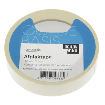 De KARWEI afplaktape 50mx25mm is een medium brede afplaktape van het KARWEI eigen merk. Afplaktape voorkomt dat er (grond)verf komt op plaatsen waar je het niet wilt hebben. Afplaktape is dus een goede hulp om nauwkeurig te kunnen werken bij eenvoudige schilderklussen zoals muren, plinten of plafonds schilderen. De afplaktape is geschikt voor het afplakken van vlakke ondergronden. De tape dient na het schilderen direct verwijderd te worden.
