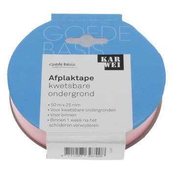De KARWEI afplaktape kwetsbare ondergronden 50mx25mm is een afplaktape van het KARWEI eigen merk. Afplaktape voorkomt dat er (grond)verf komt op plaatsen waar je het niet wilt hebben. De afplaktape is geschikt voor gebruik op kwetsbare ondergronden, zoals behang en verflagen. De tape dient na het schilderen direct verwijderd te worden.