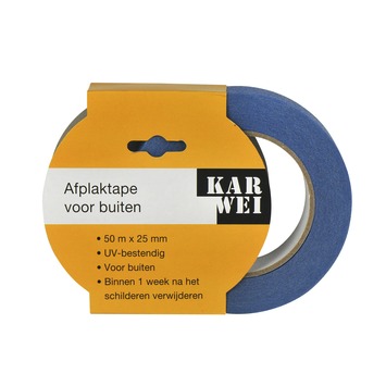De KARWEI afplaktape uv bestendig 50mx25mm blauw is een middelbrede schilderstape van het KARWEI eigen merk. Omdat de schilderstape UV bestendig is droogt de tapen niet uit en kan daardoor ook buiten gebruikt worden. Daarnaast kan de tape langer blijven zitten dan reguliere tape. De tape dient bij voorkeur (net als andere schilderstape) direct na de laatste schilderlaag direct verwijderd te worden, maar deze tape kan tot 7 dagen blijven zitten zonder lijmresten achter te laten. Dat is wel mits de ondergrond goed schoon en vetvrij is.