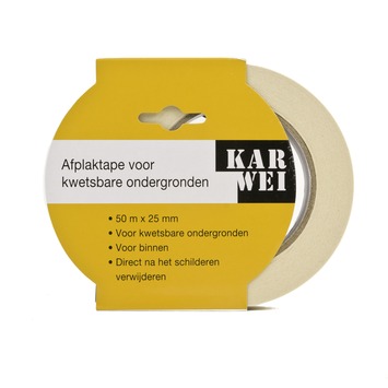 De KARWEI afplaktape voor kwetsbare ondergronden 50mx25mm is een schilderstape voor delicate ondergronden van het KARWEI eigen merk. De schilderstape is geschikt voor kwetsbare ondergronden zoals behang en verflagen. De tape dient na het schilderen direct verwijderd te worden.