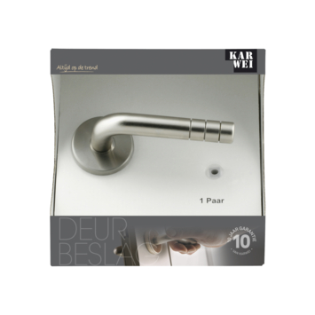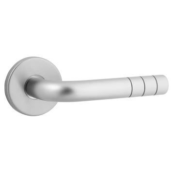 Deurkruk. Type Alvaro mat vernikkeld (RVS look), op rond rozet. De deurklink is vast gemonteerd op het rozet en is voorzien van een veer waardoor de kruk niet gaat hangen. In de serie Alvaro zijn ook de WC 63/8, blind schild en sleutelgat 56mm beschikbaar. Eveneens zijn er bijpassende cilinder -en sleutelplaatjes en wc garnituur te verkrijgen. Het is mogelijk om in de bouwmarkt afwijkende WC, sleutel en cilindermaten te bestellen.