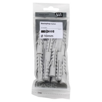 De KARWEI Basisplug nylon Ø 10mm, de meest gebruikte plug voor toepassing in massieve bouwmaterialen, zoals beton en massieve steen. U koopt de basisplug per 12 stuks. De basisplug is 50mm lang en heeft diepe vertanding. Zo bevestigt u met deze plug middelzware materialen aan muren en wanden, bijvoorbeeld schilderijen, plinten en legplanken. De Wij adviseren een schroef van tussen 6 en 8mm te gebruiken met een lengte van 60mm. Als minimale boordiepte adviseren wij 55mm aan te houden.