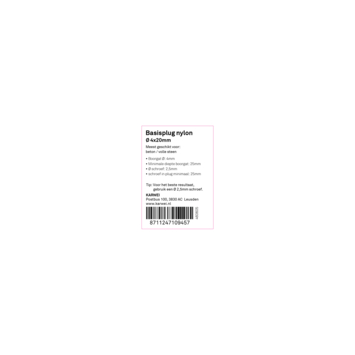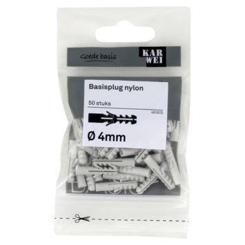 De KARWEI Basisplug nylon Ø 4mm, de meest gebruikte plug voor toepassing in massieve bouwmaterialen, zoals beton en massieve steen. U koopt de basisplug per 50 stuks. De basisplug is 20mm lang en heeft diepe vertanding. Zo bevestigt u met deze plug middelzware materialen aan muren en wanden, bijvoorbeeld schilderijen, plinten en legplanken. De Wij adviseren een schroef van 2,5mm te gebruiken met een lengte van 25mm. Als minimale boordiepte adviseren wij 25mm aan te houden.