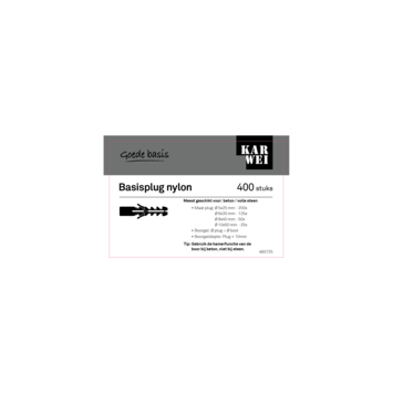 Pluggen nodig voor het bevestigen van objecten aan een muur? KARWEI Basisplug nylon Ø 5, 6, 8 en 10mm voordeelpak bevat maar liefst 400 stuks pluggen voor universeel gebruik. De pluggen zijn geschikt voor bevestiging in beton en massieve steen. Let op dat u het boorgat in de juiste grootte maakt. Hierbij kunt u ervan uitgaan dat het boorgat even groot moet zijn als de diameter van de plug. In dit voordeelpak met grijze pluggen zitten pluggen met verschillende afmetingen: 5, 6, 8 and 10mm. De grote pluggen kunnen meer belast worden dan de kleine pluggen. De pluggen in deze voordeelverpakking met 400 pluggen is gemaakt van nylon.
