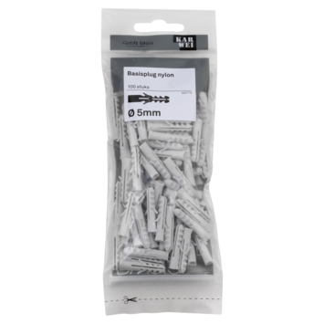 De KARWEI Basisplug nylon Ø 5mm, de meest gebruikte plug voor toepassing in massieve bouwmaterialen, zoals beton en massieve steen. U koopt de basisplug per 100 stuks. De basisplug is 25mm lang en heeft diepe vertanding. Zo bevestigt u met deze plug middelzware materialen aan muren en wanden, bijvoorbeeld schilderijen, plinten en legplanken. De Wij adviseren een schroef van tussen 2,5 en 4mm te gebruiken met een lengte van 30mm. Als minimale boordiepte adviseren wij 30mm aan te houden.