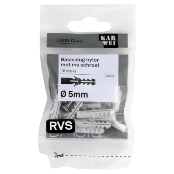 De KARWEI Basisplug nylon Ø 5mm met schroef RVS, de meest gebruikte plug voor toepassing in massieve bouwmaterialen, zoals beton en massieve steen. U koopt de basisplug per 16 stuks, inclusief universeelschroef vz rvs van 3,5x35mm . De basisplug is 25mm lang en heeft diepe vertanding .Zo bevestigt u met deze plug en houtschroef middelzware materialen aan muren en wanden, bijvoorbeeld schilderijen, plinten en legplanken. De universeelschroef vz rvs middelzware materialen aan muren en wanden, bijvoorbeeld schilderijen, plinten en legplanken. De universeelschroef vz rvs roest niet waardoor u deze ook buiten of in natte ruimtes, zoals de badkamer, kunt toepassen. De universeelschroef vz rvs is 3,5mm dik en 35mm lang. Voorboren met een boormaat van 5mm benodigd. Dan zorgt u voor de meest stevige bevestiging. De verpakking bevat in totaal 16 basispluggen van 5mm dikte met bijbehorende universeelschroef vz rvs