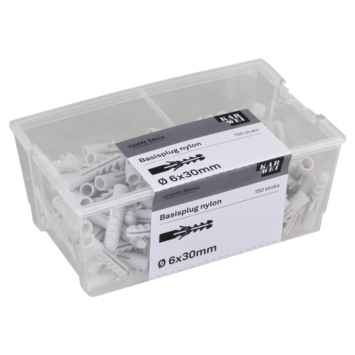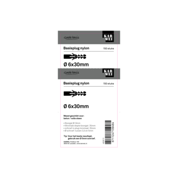 De KARWEI Basisplug nylon Ø 6mm, de meest gebruikte plug voor toepassing in massieve bouwmaterialen, zoals beton en massieve steen. U koopt de basisplug per 150 stuks. De basisplug is 30mm lang en heeft diepe vertanding. Zo bevestigt u met deze plug middelzware materialen aan muren en wanden, bijvoorbeeld schilderijen, plinten en legplanken. De Wij adviseren een schroef van tussen 3,5 en 5mm te gebruiken met een lengte van 35mm. Als minimale boordiepte adviseren wij 35mm aan te houden.