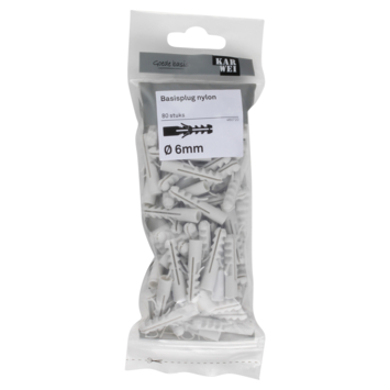 De KARWEI Basisplug nylon Ø 6mm, de meest gebruikte plug voor toepassing in massieve bouwmaterialen, zoals beton en massieve steen. U koopt de basisplug per 80 stuks. De basisplug is 30mm lang en heeft diepe vertanding. Zo bevestigt u met deze plug middelzware materialen aan muren en wanden, bijvoorbeeld schilderijen, plinten en legplanken. De Wij adviseren een schroef van tussen 3,5 en 5mm te gebruiken met een lengte van 35mm. Als minimale boordiepte adviseren wij 35mm aan te houden.