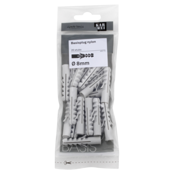 De KARWEI Basisplug nylon Ø 8mm, de meest gebruikte plug voor toepassing in massieve bouwmaterialen, zoals beton en massieve steen. U koopt de basisplug per 20 stuks. De basisplug is 40mm lang en heeft diepe vertanding. Zo bevestigt u met deze plug middelzware materialen aan muren en wanden, bijvoorbeeld schilderijen, plinten en legplanken. De Wij adviseren een schroef van tussen 4 en 6mm te gebruiken met een lengte van 45mm. Als minimale boordiepte adviseren wij 45mm aan te houden.