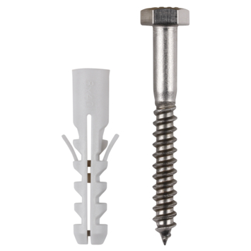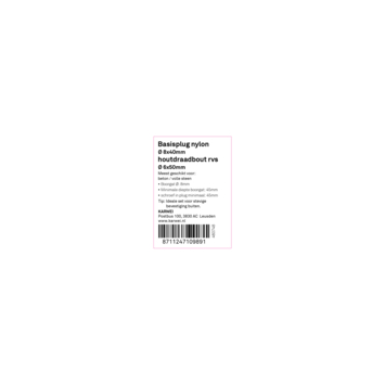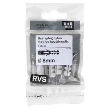 De KARWEI Basisplug nylon Ø 8mm met houtdraadbout RVS, de meest gebruikte plug voor toepassing in massieve bouwmaterialen, zoals beton en massieve steen. U koopt de basisplug per 4 stuks, inclusief houtdraadbout rvs van 6x40mm . De basisplug is 40mm lang en heeft diepe vertanding .Zo bevestigt u met deze plug en houtschroef middelzware materialen aan muren en wanden, bijvoorbeeld schilderijen, plinten en legplanken. De houtdraadbout rvs middelzware materialen aan muren en wanden, bijvoorbeeld schilderijen, plinten en legplanken. De houtdraadbout rvs roest niet waardoor u deze ook buiten of in natte ruimtes, zoals de badkamer, kunt toepassen. De houtdraadbout rvs is 6mm dik en 40mm lang. Voorboren met een boormaat van 8mm benodigd. Dan zorgt u voor de meest stevige bevestiging. De verpakking bevat in totaal 4 basispluggen van 8mm dikte met bijbehorende houtdraadbout rvs