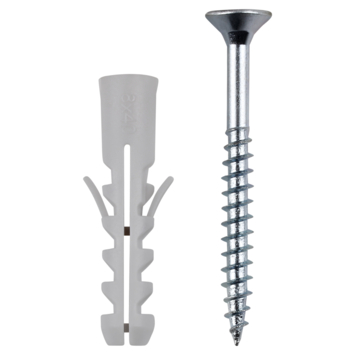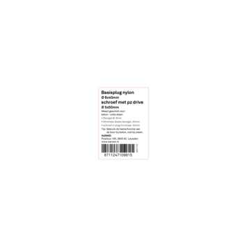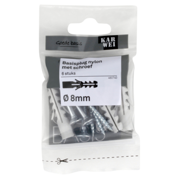De KARWEI Basisplug nylon Ø 8mm met schroef, de meest gebruikte plug voor toepassing in massieve bouwmaterialen, zoals beton en massieve steen. U koopt de basisplug per 6 stuks, inclusief universeelschroef vz van 5x50mm . De basisplug is 40mm lang en heeft diepe vertanding .Zo bevestigt u met deze plug en houtschroef middelzware materialen aan muren en wanden, bijvoorbeeld schilderijen, plinten en legplanken. De universeelschroef vz middelzware materialen aan muren en wanden, bijvoorbeeld schilderijen, plinten en legplanken. De universeelschroef vz roest niet waardoor u deze ook buiten of in natte ruimtes, zoals de badkamer, kunt toepassen. De universeelschroef vz is 5mm dik en 50mm lang. Voorboren met een boormaat van 8mm benodigd. Dan zorgt u voor de meest stevige bevestiging. De verpakking bevat in totaal 6 basispluggen van 8mm dikte met bijbehorende universeelschroef vz