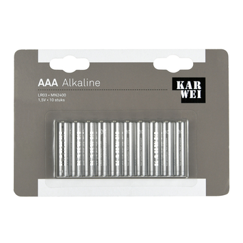 KARWEI Batterij Alkaline AAA 10 stuks ook bekend als LR3, LR03, MN2400, AM4, HP16, micro batterij, potlood batterij. Zijn geschikt voor verschillende toepassingen zoals fotocamera's, zaklampen, afstandsbedieningen en speelgoed. In één verpakking zitten 10 AAA batterijen.