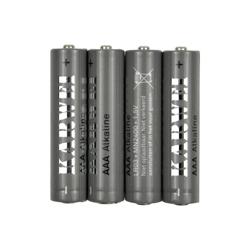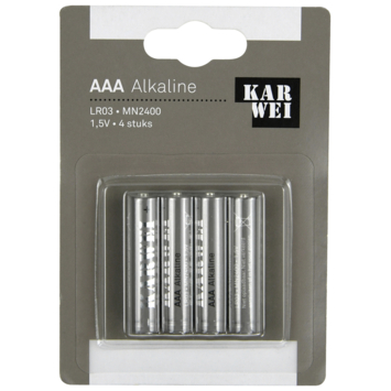 KARWEI Batterij Alkaline AAA 4 stuks ook bekend als LR3, LR03, MN2400, AM4, HP16, micro batterij, potlood batterij. Zijn geschikt voor verschillende toepassingen zoals fotocamera's, zaklampen, afstandsbedieningen en speelgoed. In één verpakking zitten 4 AAA batterijen.