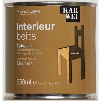 De KARWEI binnenbeits interieur antraciet transparant 250 ml is ideaal voor het langdurig beschermen van houten meubels binnenshuis. Deze zijdeglanzende beits is transparant, waardoor de houtnerf zichtbaar blijft. De beits op waterbasis droogt snel en is reukarm. Je kunt de beits al na 4 uur overschilderen en is eenvoudig met een kwast of roller aan te brengen. Het blik bevat 250 milliliter antracietkleurige beits, dit is goed voor een oppervlakte van zo'n 3 vierkante meter. De KARWEI binnenbeits is verkrijgbaar in diverse kleuren. Zit jou kleur er toch niet bij, dan kun je deze laten mengen in de KARWEI bouwmarkt op de verfmengmachine.