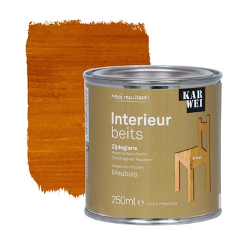 De KARWEI binnenbeits interieur grenen transparant 250 ml is ideaal voor het langdurig beschermen van houten meubels binnenshuis. Deze zijdeglanzende beits is transparant, waardoor de houtnerf zichtbaar blijft. De beits op waterbasis droogt snel en is reukarm. Je kunt de beits al na 4 uur overschilderen en is eenvoudig met een kwast of roller aan te brengen. Het blik bevat 250 milliliter grenen beits, dit is goed voor een oppervlakte van zo'n 3 vierkante meter. De KARWEI binnenbeits is verkrijgbaar in diverse kleuren. Zit jou kleur er toch niet bij, dan kun je deze laten mengen in de KARWEI bouwmarkt op de verfmengmachine.