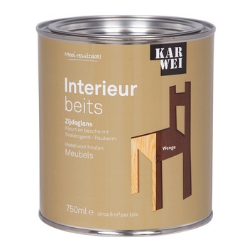 De KARWEI binnenbeits interieur wengé transparant 750 ml is ideaal voor het langdurig beschermen van houten meubels binnenshuis. Deze zijdeglanzende beits is transparant, waardoor de houtnerf zichtbaar blijft. De beits op waterbasis droogt snel en is reukarm. Je kunt de beits al na 4 uur overschilderen en is eenvoudig met een kwast of roller aan te brengen. Het blik bevat 750 milliliter wengé beits, dit is goed voor een oppervlakte van zo'n 9 vierkante meter. De KARWEI binnenbeits is verkrijgbaar in diverse kleuren. Zit jou kleur er toch niet bij, dan kun je deze laten mengen in de KARWEI bouwmarkt op de verfmengmachine.