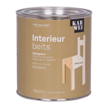 De KARWEI binnenbeits interieur white wash transparant 750 ml is ideaal voor het langdurig beschermen van houten meubels binnenshuis. Deze zijdeglanzende beits is transparant, waardoor de houtnerf zichtbaar blijft. De beits op waterbasis droogt snel en is reukarm. Je kunt de beits al na 4 uur overschilderen en is eenvoudig met een kwast of roller aan te brengen. Het blik bevat 750 milliliter white wash beits, dit is goed voor een oppervlakte van zo'n 9 vierkante meter. De KARWEI binnenbeits is verkrijgbaar in diverse kleuren. Zit jou kleur er toch niet bij, dan kun je deze laten mengen in de KARWEI bouwmarkt op de verfmengmachine.