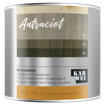 KARWEI binnenbeits transparant antraciet 250 ml is een kras- en stootvaste, zijdeglazende beits op waterbasis. Voor het afwerken van (onbehandelde) houten meubels, deuren en kozijnen, plinten, lambrisering en ander timmerwerk binnenshuis. Is vochtregulerend en beschermt tegen vocht en vlekken en accentueert de houtnerf. Sneldrogend, geur- en oplosmiddelarm. De uiteindelijke kleur is afhankelijk van het soort hout en aantal lagen.