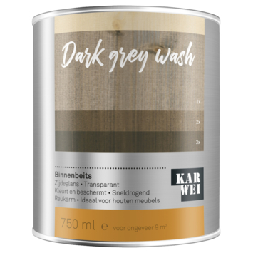 KARWEI binnenbeits transparant dark grey wash 750 ml is een kras- en stootvaste, zijdeglazende beits op waterbasis. Voor het afwerken van (onbehandelde) houten meubels, deuren en kozijnen, plinten, lambrisering en ander timmerwerk binnenshuis. Is vochtregulerend en beschermt tegen vocht en vlekken en accentueert de houtnerf. Sneldrogend, geur- en oplosmiddelarm. De uiteindelijke kleur is afhankelijk van het soort hout en aantal lagen.