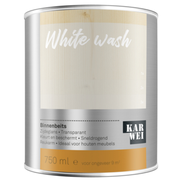 KARWEI binnenbeits transparant white wash 750 ml is een kras- en stootvaste, zijdeglazende beits op waterbasis. Voor het afwerken van (onbehandelde) houten meubels, deuren en kozijnen, plinten, lambrisering en ander timmerwerk binnenshuis. Is vochtregulerend en beschermt tegen vocht en vlekken en accentueert de houtnerf. Sneldrogend, geur- en oplosmiddelarm. De uiteindelijke kleur is afhankelijk van het soort hout en aantal lagen.
