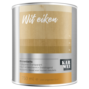 KARWEI binnenbeits transparant wit eiken 750 ml is een kras- en stootvaste, zijdeglazende beits op waterbasis. Voor het afwerken van (onbehandelde) houten meubels, deuren en kozijnen, plinten, lambrisering en ander timmerwerk binnenshuis. Is vochtregulerend en beschermt tegen vocht en vlekken en accentueert de houtnerf. Sneldrogend, geur- en oplosmiddelarm. De uiteindelijke kleur is afhankelijk van het soort hout en aantal lagen.