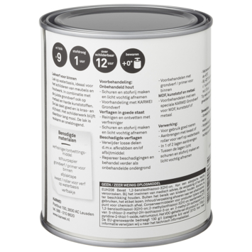 Deze KARWEI binnenlak is een verf op waterbasis. Verf op waterbasis is de beste keus voor binnenshuis. Het is geurarm en blijft langer mooi van kleur. Deze kras- en stootvaste verf is geschikt voor hout, en in combinatie met de daarvoor geschikte grondverf, ook op metaal en kunststoffen. Voor een optimaal resultaat van de KARWEI binnenlak behandel je de ondergrond eerst met de KARWEI grondverf voor binnen. Een uur na het aanbrengen van de verf is deze reeds stofdroog, na 20 uur kan je de volgende laag aanbrengen. De lak is te gebruiken als afwerking van nieuw onbehandelde delen, maar ook op bestaand schilderwerk of om meubels een nieuwe uitstraling te geven. De binnenlak is eenvoudig aan te brengen met een kwast of lakroller voor verf op waterbasis.