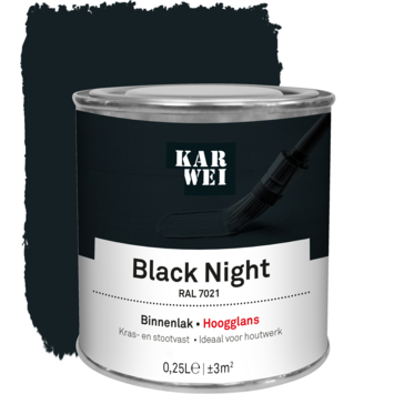 De KARWEI binnenlak hoogglans RAL 7021 black night 250 ml is een watergedragen verf die ideaal is voor binnenshuis. De lak is kras- en stootvast, waardoor je deuren, kozijnen en meubels goed kunt beschermen tegen slijtage. Omdat de verf op waterbasis is, is hij geurarm en blijft hij langer mooi van kleur. Je kunt de lak op hout gebruiken en met de juiste grondverf ook op metaal en kunststof. De verf is stofdroog na 1 uur en je kunt de volgende laag aanbrengen na 12 uur.