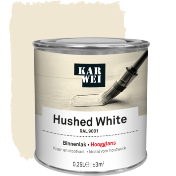 De KARWEI binnenlak hoogglans RAL 9001 hushed white 250 ml is een watergedragen verf die ideaal is voor binnenshuis. De lak is kras- en stootvast, waardoor je deuren, kozijnen en meubels goed kunt beschermen tegen slijtage. Omdat de verf op waterbasis is, is hij geurarm en blijft hij langer mooi van kleur. Je kunt de lak op hout gebruiken en met de juiste grondverf ook op metaal en kunststof. De verf is stofdroog na 1 uur en je kunt de volgende laag aanbrengen na 12 uur. Een blik van 250 ml is voldoende voor een oppervlakte van ongeveer 3 m². Voor het beste resultaat gebruik je de lak bij temperaturen tussen de 8 en 25°C. De verf is makkelijk aan te brengen met een kwast of lakroller voor watergedragen verf. Deze binnenlak is verkrijgbaar in 14 verschillende kleuren en drie glansgraden: hoogglans, zijdeglans en mat. Heb je een specifieke kleur in gedachten? Laat deze dan op maat mengen door een kleurspecialist in de bouwmarkt.