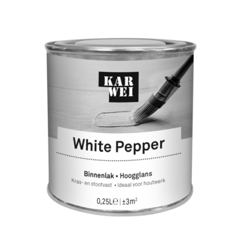 De KARWEI binnenlak hoogglans white pepper 250 ml is een watergedragen verf die ideaal is voor binnenshuis. De lak is kras- en stootvast, waardoor je deuren, kozijnen en meubels goed kunt beschermen tegen slijtage. Omdat de verf op waterbasis is, is hij geurarm en blijft hij langer mooi van kleur. Je kunt de lak op hout gebruiken en met de juiste grondverf ook op metaal en kunststof. De verf is stofdroog na 1 uur en je kunt de volgende laag aanbrengen na 12 uur.